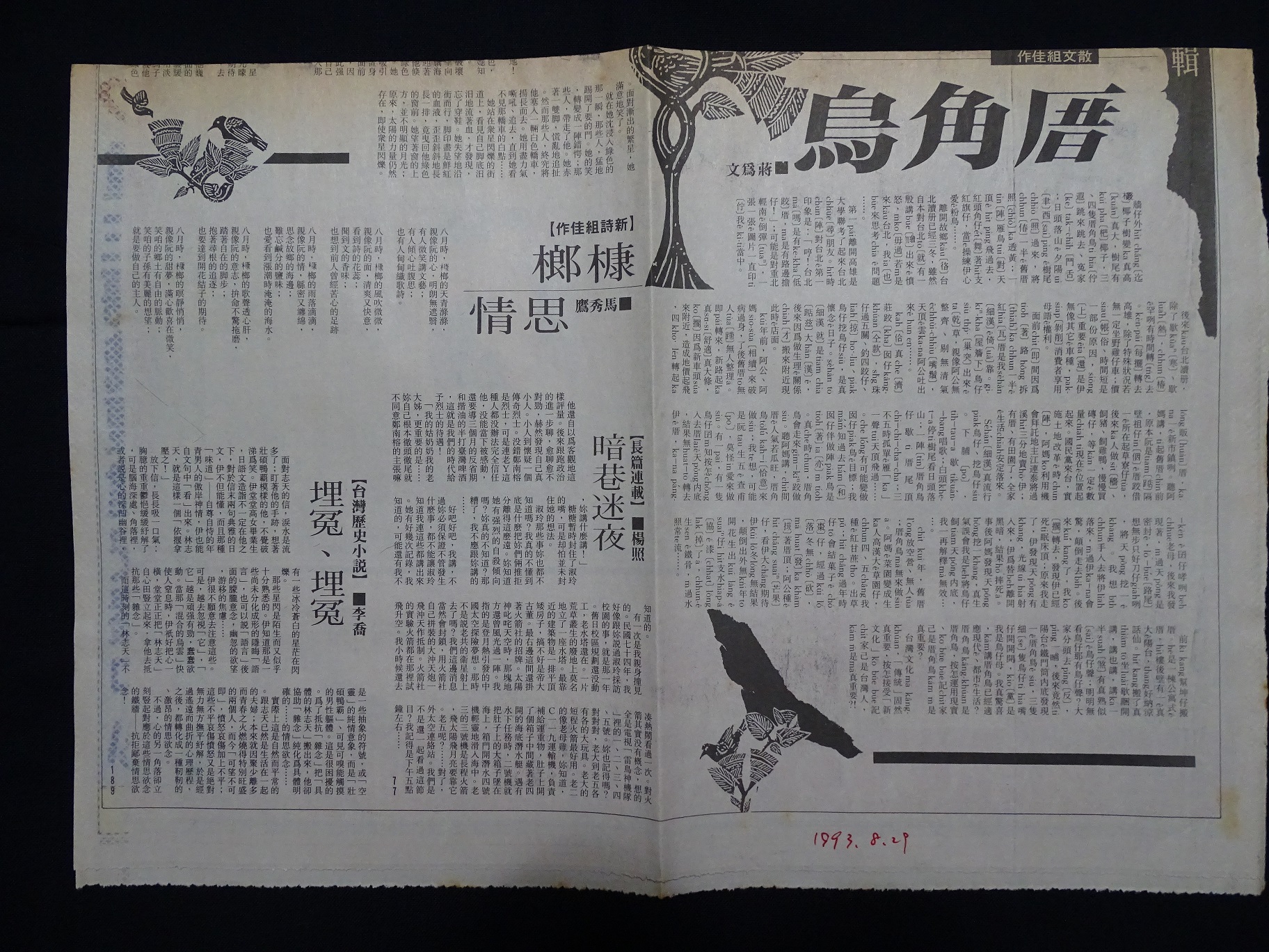 「厝角鳥」刊tī自立晚報本土副刊(1993/8/29)