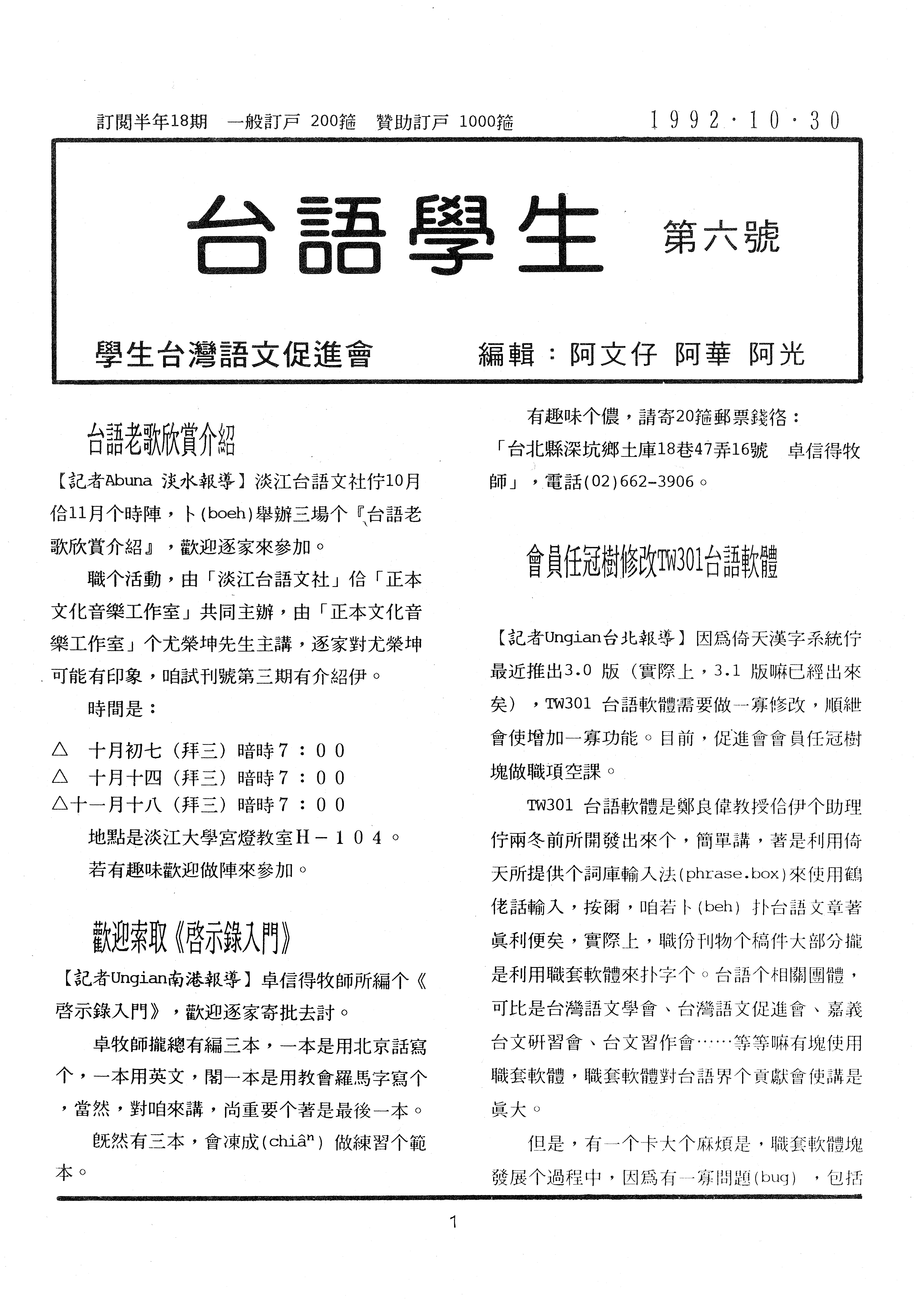 台語學生第六期(1992/10/30)